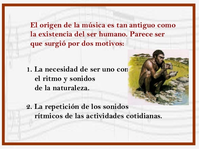 El origen de la música es tan antiguo como la existencia del ser humano. Parece ser que surgió por dos motivos: