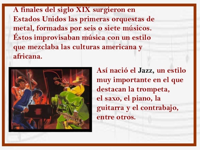 Así nació el Jazz, un estilo muy importante en el que destacan la trompeta, el saxo, el piano, la guitarra y el contrabajo, entre otros.
