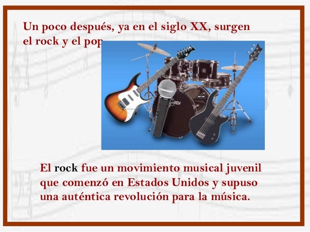 Un poco después, ya en el siglo XX, surgenel rock y el pop. El rock fue un movimiento musical juvenil que comenzó en Estados Unidos y supuso una auténtica revolución para la música.