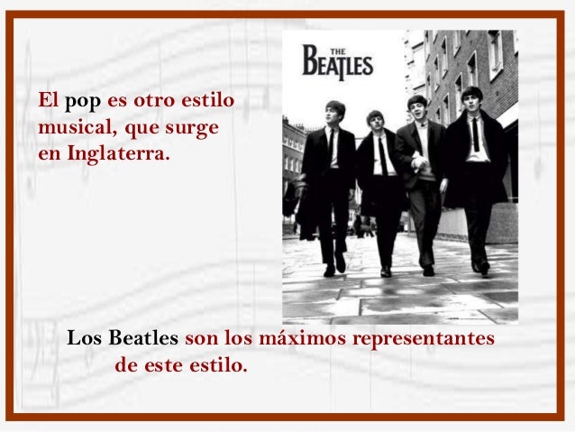 El pop es otro estilo musical, que surge en Inglaterra. Los Beatles son los máximos representantes de este estilo.