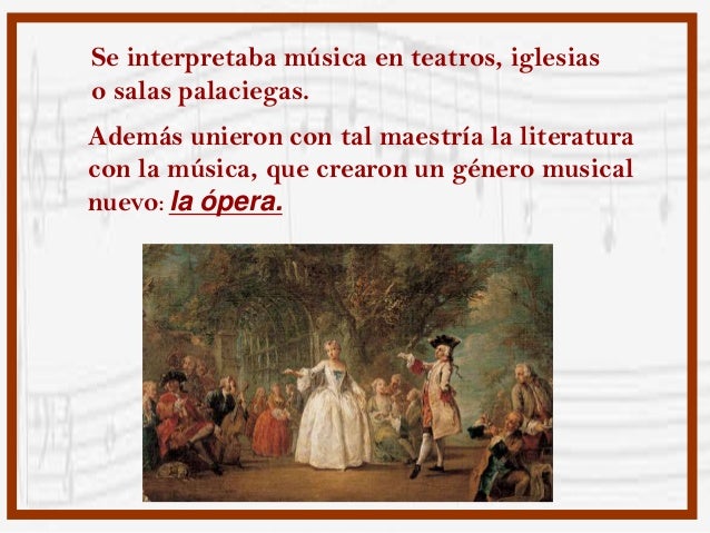 2. Se interpretaba música en teatros, iglesias o salas palaciegas.Además unieron con tal maestría la literatura con la música, que crearon un género musical nuevo: la ópera.