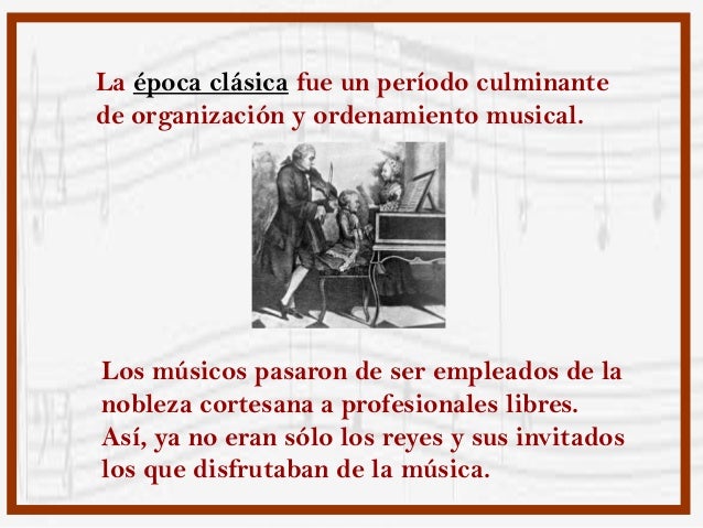 La época clásica fue un período culminante de organización y ordenamiento musical.Los músicos pasaron de ser empleados de la nobleza cortesana a profesionales libres.Así, ya no eran sólo los reyes y sus invitados los que disfrutaban de la música.