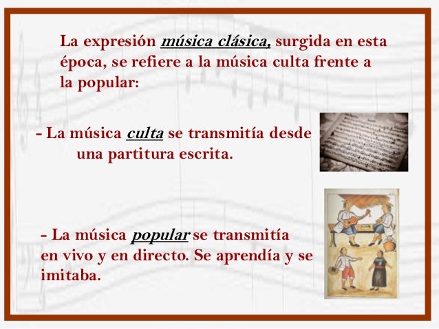 La expresión música clásica, surgida en esta época, se refiere a la música culta frente a la popular:- La música culta se transmitía desde una partitura escrita.- La música popular se transmitía en vivo y en directo. Se aprendía y se imitaba.