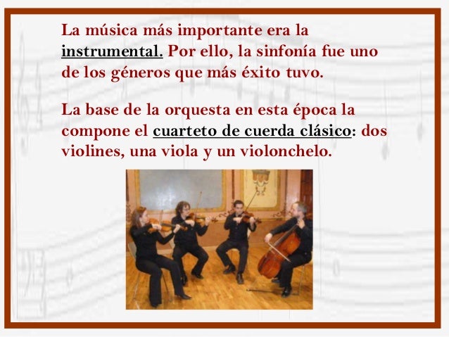 La música más importante era la instrumental. Por ello, la sinfonía fue uno de los géneros que más éxito tuvo.La base de la orquesta en esta época la compone el cuarteto de cuerda clásico: dos violines, una viola y un violonchelo.
