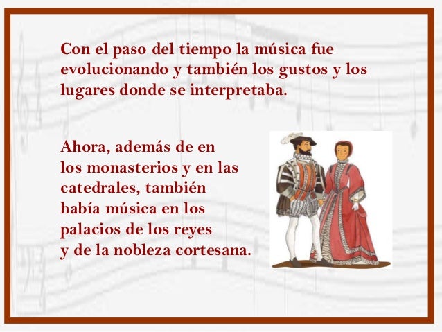Ahora, además de en los monasterios y en las catedrales, también había música en los palacios de los reyes y de la nobleza cortesana.