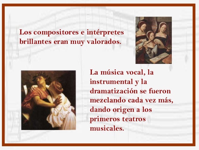 Los compositores e intérpretes brillantes eran muy valorados. La música vocal, la instrumental y la dramatización se fueron mezclando cada vez más, dando origen a los primeros teatros musicales.